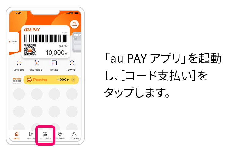 au PayではQRコード決済も非常に便利です。「QRコード」を選択すると、自分専用のQRコードが生成され、その場で提示するだけで簡単に支払いが可能になります。