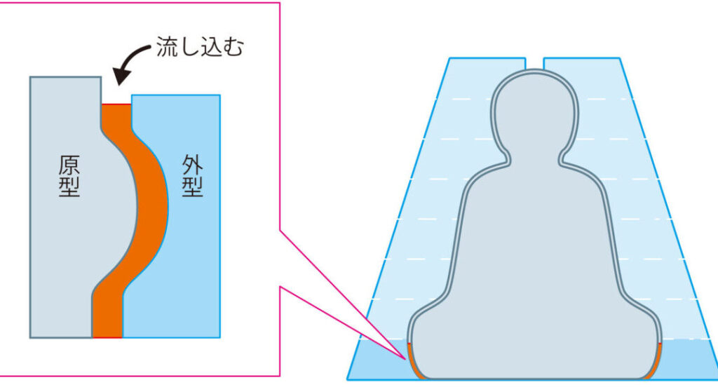 - 型に溶融金属(通常は銅)を流し込み、大仏本体となる部分が形成されます。このプロセスには高温管理と正確なタイミングが要求されます。