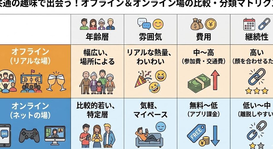 最近では、オンラインプラットフォームも新たな出会いの場となっています。SNSやフォーラムなどで自分と同じ趣味を持った人々と繋がることができ、その中から実際に対面して交流する機会も増えています。以下はその具体例です: