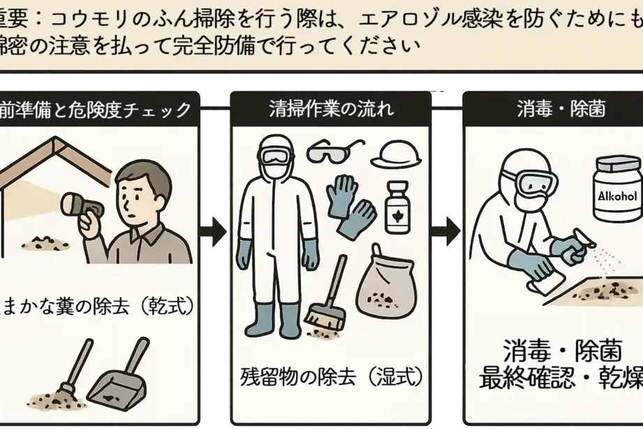 私たちがコウモリのフンを安全に取り扱うためには、いくつかの重要な手順を踏むことが必要です。適切な準備と注意が求められる作業であり、これによって健康リスクを最小限に抑えることができます。以下では、その具体的な手順について説明します。