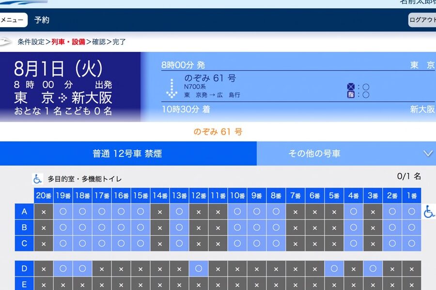 - 検索ボタンをクリック: 入力後、「検索」ボタンを押すと、利用可能な列車とその座席状況が表示されます。