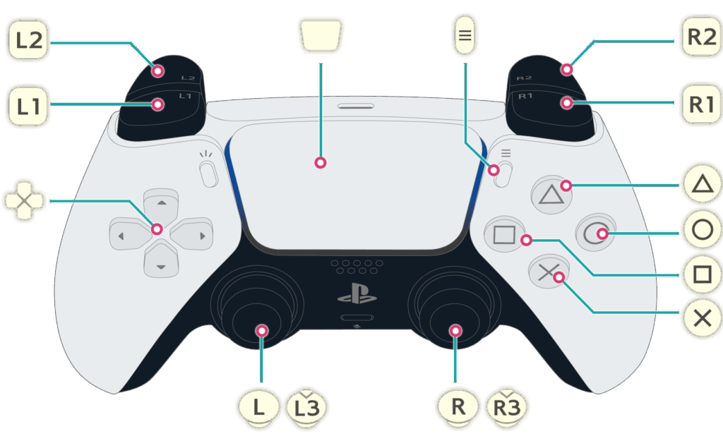 PS5のDualSenseコントローラーは、その革新的なデザインと機能で知られています。以下に、主要なボタンとその役割を示します: